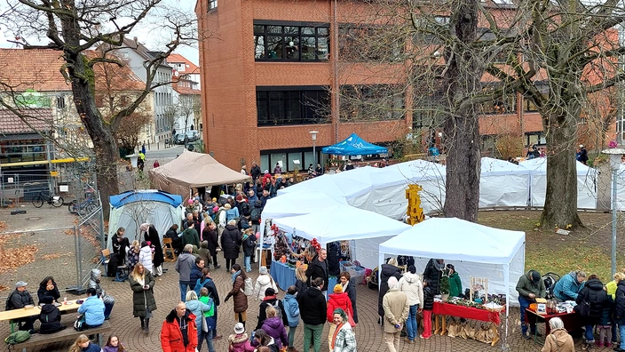 Der Duft von frisch gebackenem Kuchen, süßen Plätzchen und Zuckerwatte zog über den Bildungscampus und sorgte gemeinsam mit Lichterketten, einer Feuerschale, Punsch und heißen Getränken für eine gemütliche, vorweihnachtliche Stimmung. An den festlich dekorierten Ständen konnten auch in diesem Jahr vielfältige Bastelarbeiten der Schüler*innen unserer Schulen erworben werden.