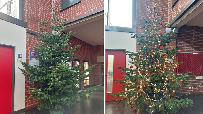 Und natürlich sind auch in diesem Jahr wieder in all unseren Schulen große Weihnachtsbäume zu finden. Pünktlich zum Christophorusmarkt stand auch im Gymnasium der geschmückte Baum und bildete den leuchtenden Mittelpunkt des Schulgebäudes. Ein besonderer Dank gilt Graf von der Schulenberg für die tollen Weihnachtsbäume!