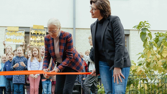 Mit einem kleinen Festakt wurden unsere neuen Räumlichkeiten jetzt auch offiziell ihrer Bestimmung übergeben: Zwei neue Stammgruppen freuen sich über wunderschöne Klassenräume und mit dem neuen Musikraum ist ein lang gehegter Wunsch Wirklichkeit geworden. Erika Borek hat das Eröffnungsband durchschnitten und konnte in den Ansprachen erleben, dass nicht nur die Erwachsenen die gelungene Farbgestaltung loben, sondern dass auch die Kinder in ihrer Sterne-Bewertung den Räumen volle Sternenzahl verliehen.