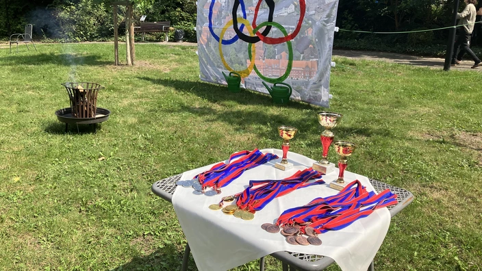 Ein Spaß für alle! Bunte Stände mit sportlichen Herausforderungen – von Dosenwerfen bis zum Kegelspiel war alles dabei – luden zum Mitmachen ein. Die Bewohner:innen ließen sich gern herausfordern und absolvierten Punkte-sammelnd jede Station. Vor einer großen Leinwand mit den olympischen Ringen brannte sogar ein „olympisches“ Feuer – es war alles sehr liebevoll vorbereitet und das Bethanien-Team aus Pflegekräften und Ehrenamtlichen zeigte vollen Einsatz, damit jede:r Bewohner:in auch mit Rollstuhl und Rollator sicher zu den Spielangeboten kam. Wir sind aber einfach auch nur stolz und glücklich über den tollen Einsatz unserer Kinder, die unermüdlich Bälle aufhoben, Kegel wieder aufstellten und anpackten, wo es nötig war… Ein großes Dankeschön an Arno, David, Jan-Christopher, Lenia, Lia, Mira und Noah und die begleitenden Kolleginnen der Grundschule Nina Höfs, Valerie Jacobi und Melissa.